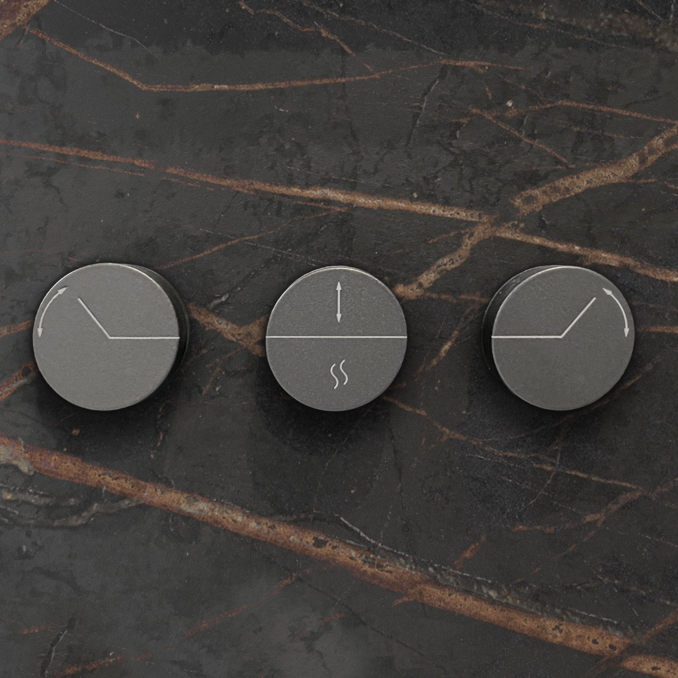Exclusive set of three round design buttons in anodized aluminum, integrated on the plateau side and available in numerous customizable finishes. Activation occurs through rotation and pressure.